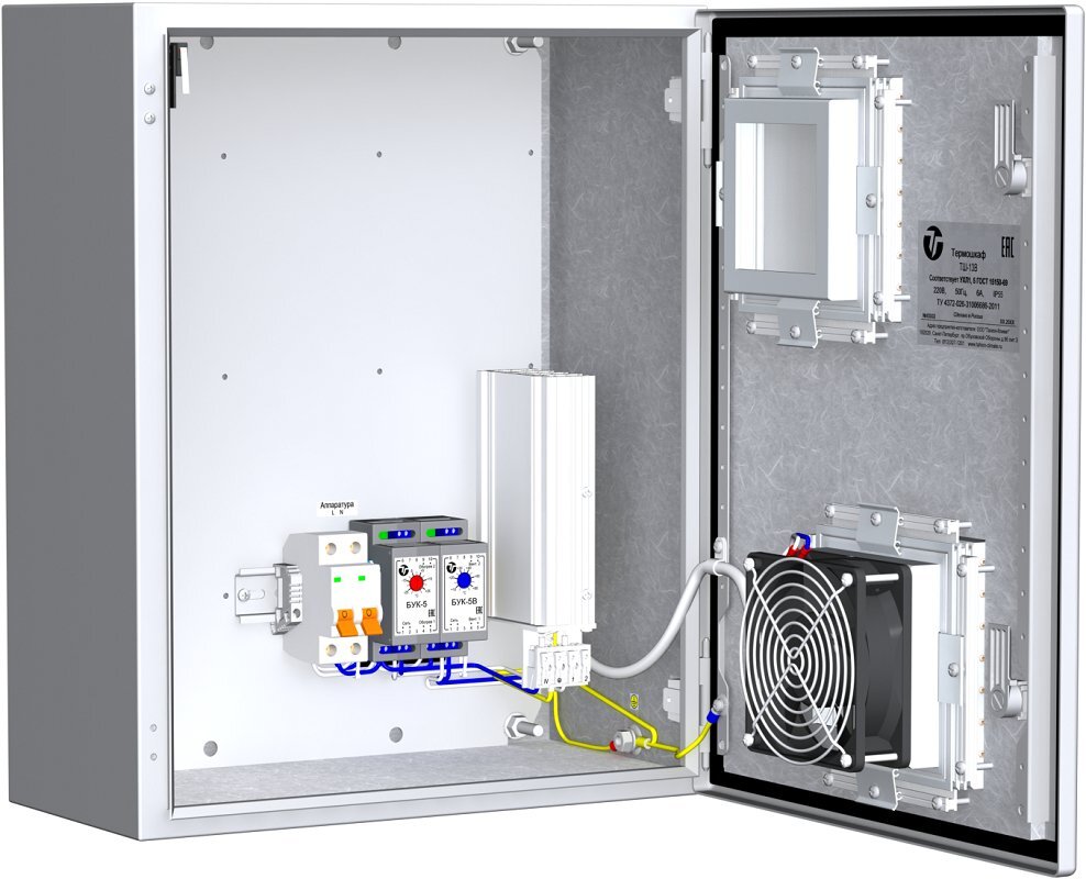 - обогреватель термошкафов ОТШ-60, оборудованный встроенным биметаллическим выключателем, ограничивающим температуру поверхности радиатора до +90°С;
