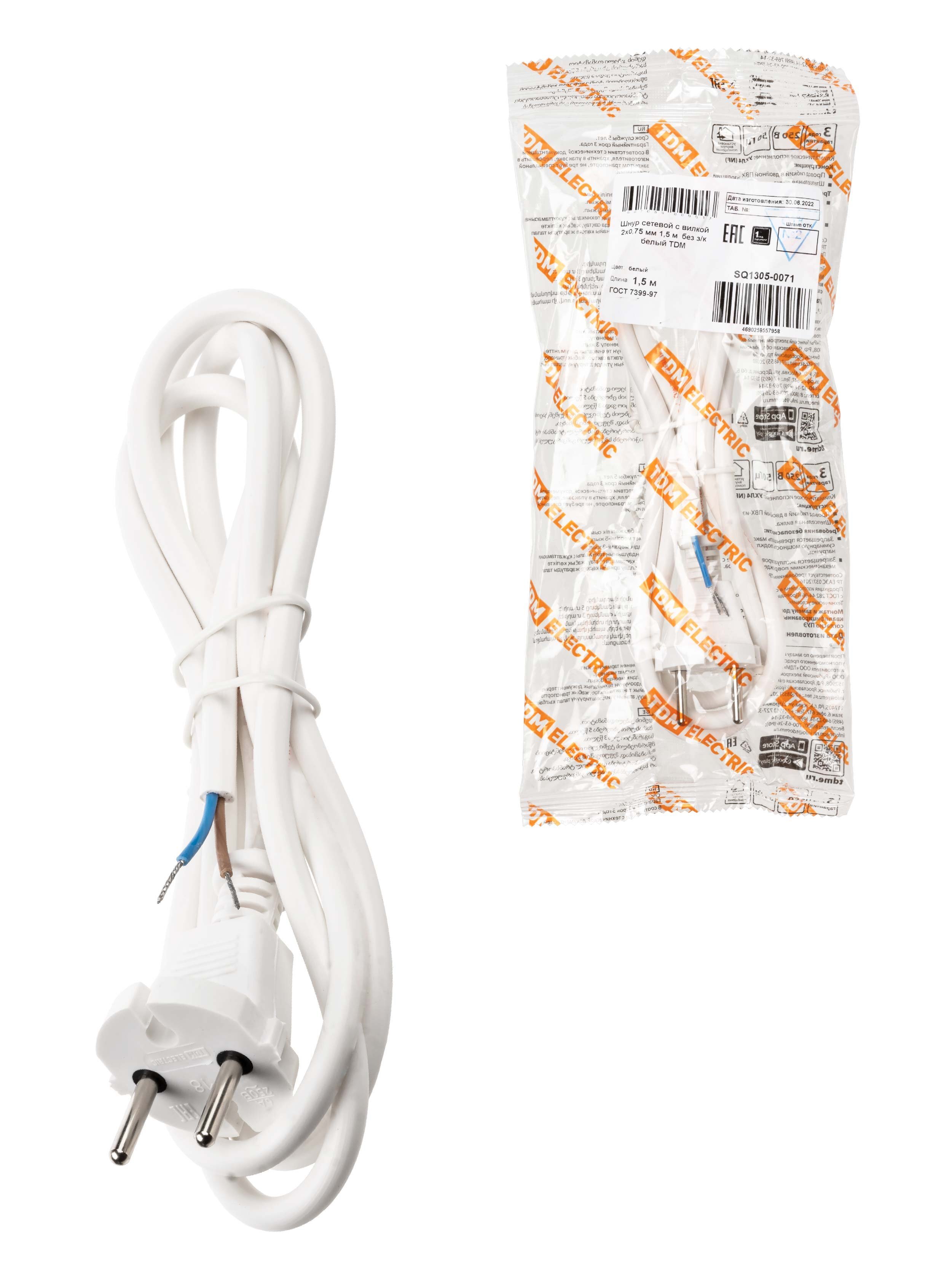 Шнур сетевой с вилкой TDM ЕLECTRIC Шнур сетевой с вилкой ПВС 2x0,75мм2 1,5м б/з белый TDM (SQ1305-0071)