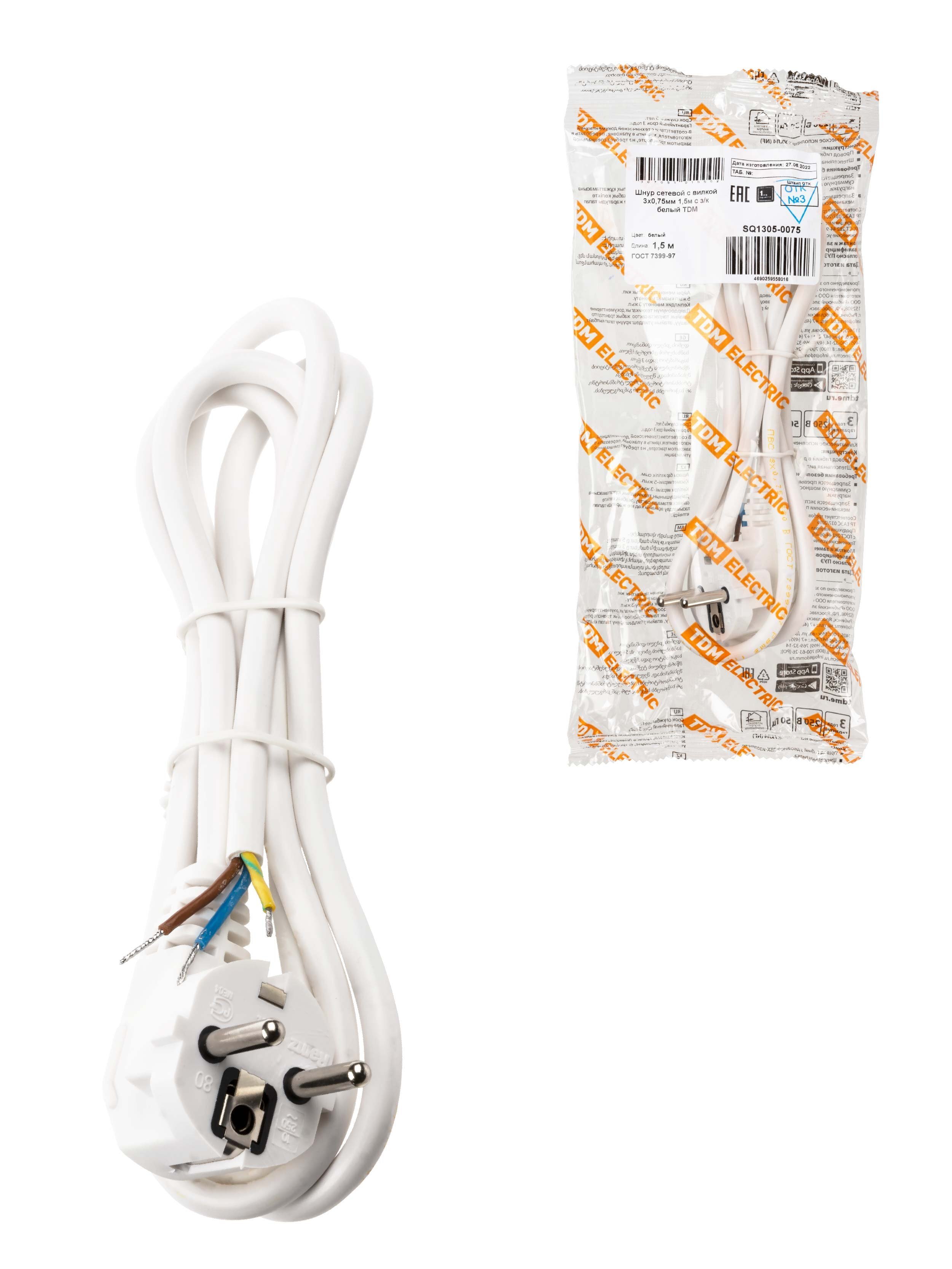 Шнур сетевой с вилкой TDM ЕLECTRIC Шнур сетевой с вилкой ПВС 3x0,75мм2 1,5м с/з белый TDM (SQ1305-0075)