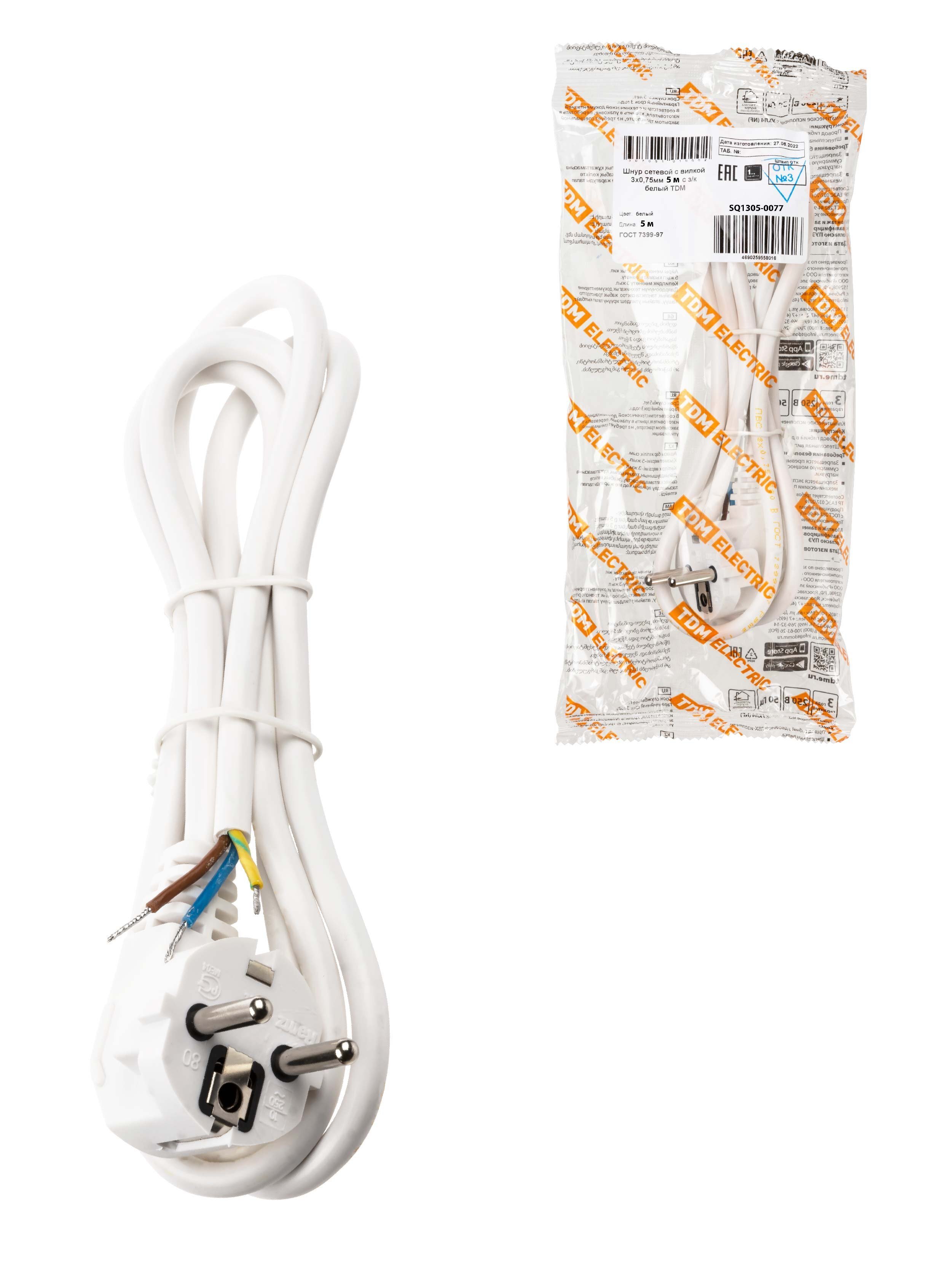Шнур сетевой с вилкой TDM ЕLECTRIC Шнур сетевой с вилкой ПВС 3x0,75мм2 5м с/з белый TDM (SQ1305-0077)