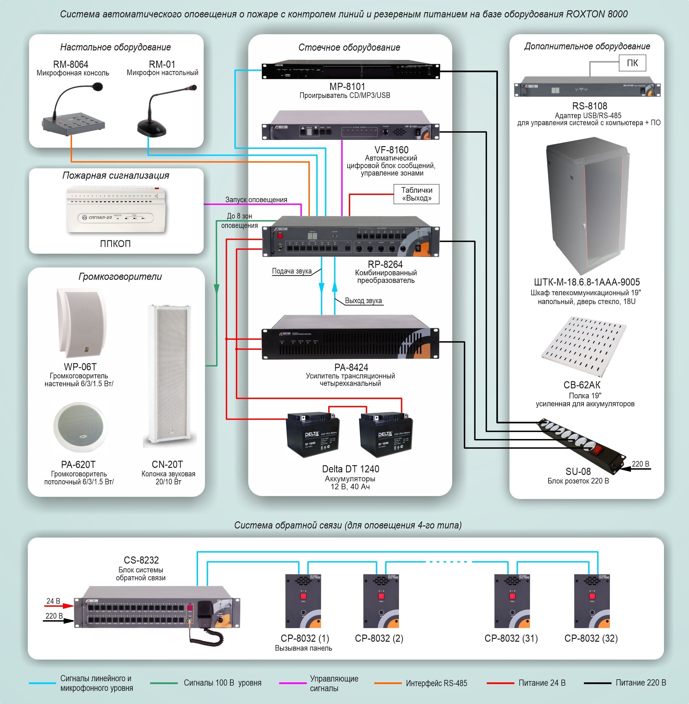 Система автоматического оповещения о пожаре с контролем линий и резервным питанием на базе оборудования ROXTON 8000 ROXTON Типовое решение: СОУЭ-004
