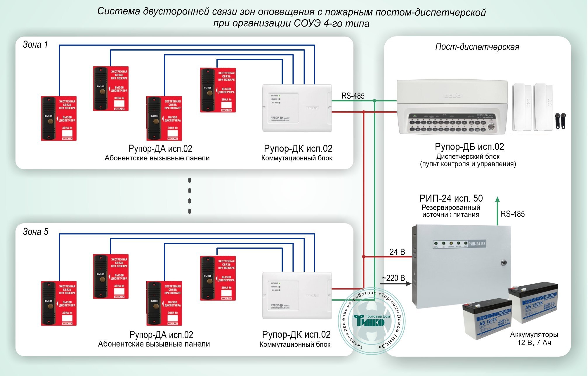 Система двусторонней связи зон оповещения с пожарным постом-диспетчерской при организации СОУЭ 4-го типа Болид Типовое решение: СОУЭ-014