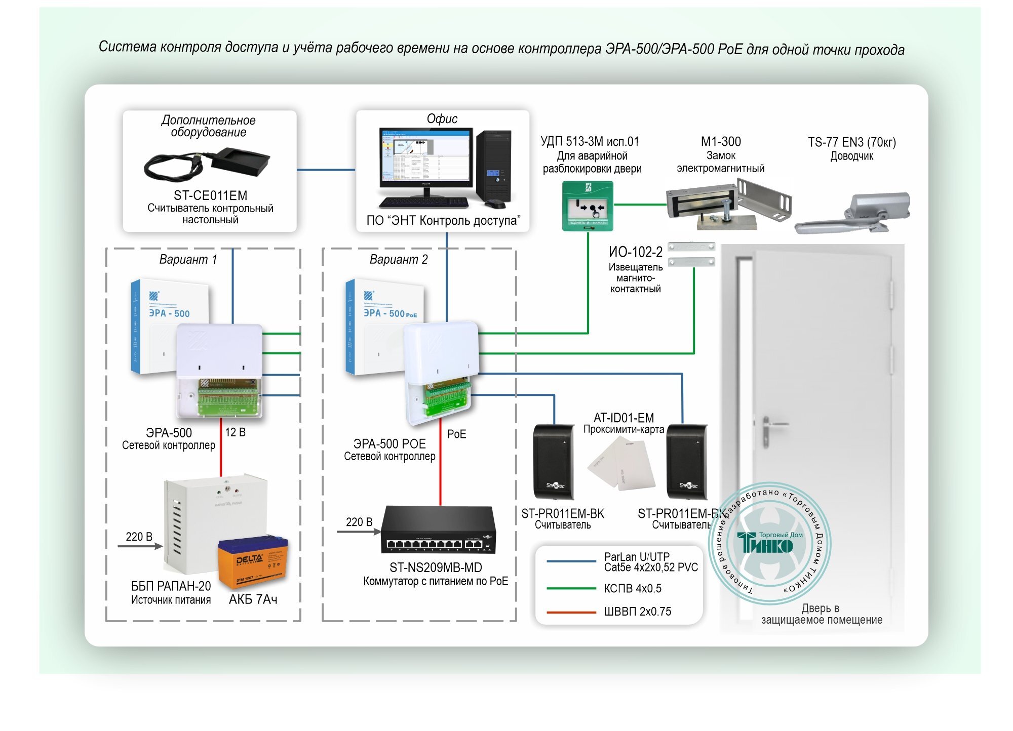 Система контроля доступа и учёта рабочего времени на основе контроллера ЭРА-500/ЭРА-500 PoE для одной точки прохода Эра новых технологий Типовое решение: СКУД-003