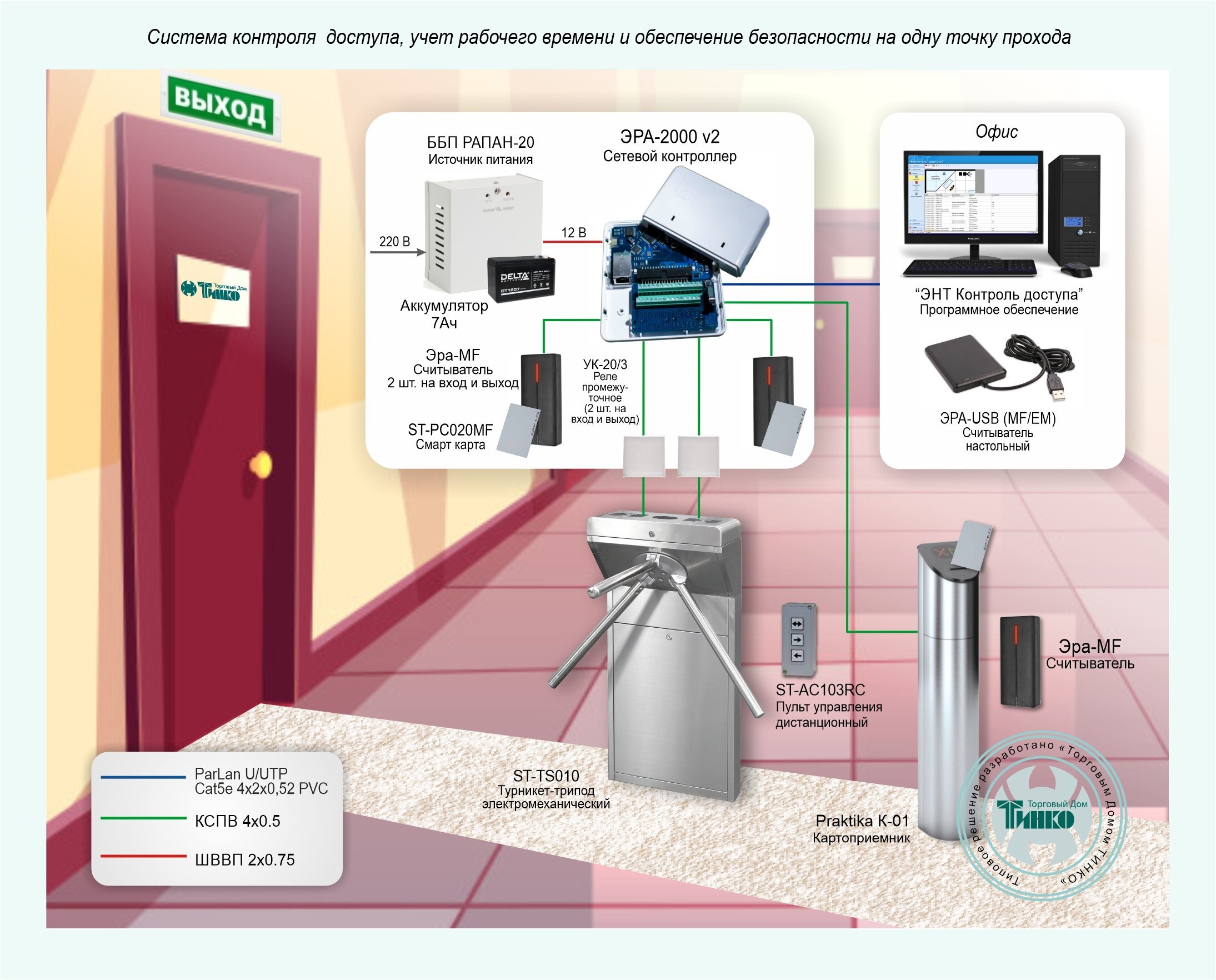 Система контроля доступа с защищенным режимом и учет рабочего времени на одну точку прохода с электромеханическим турникетом Эра новых технологий Типовое решение: СКУД-007