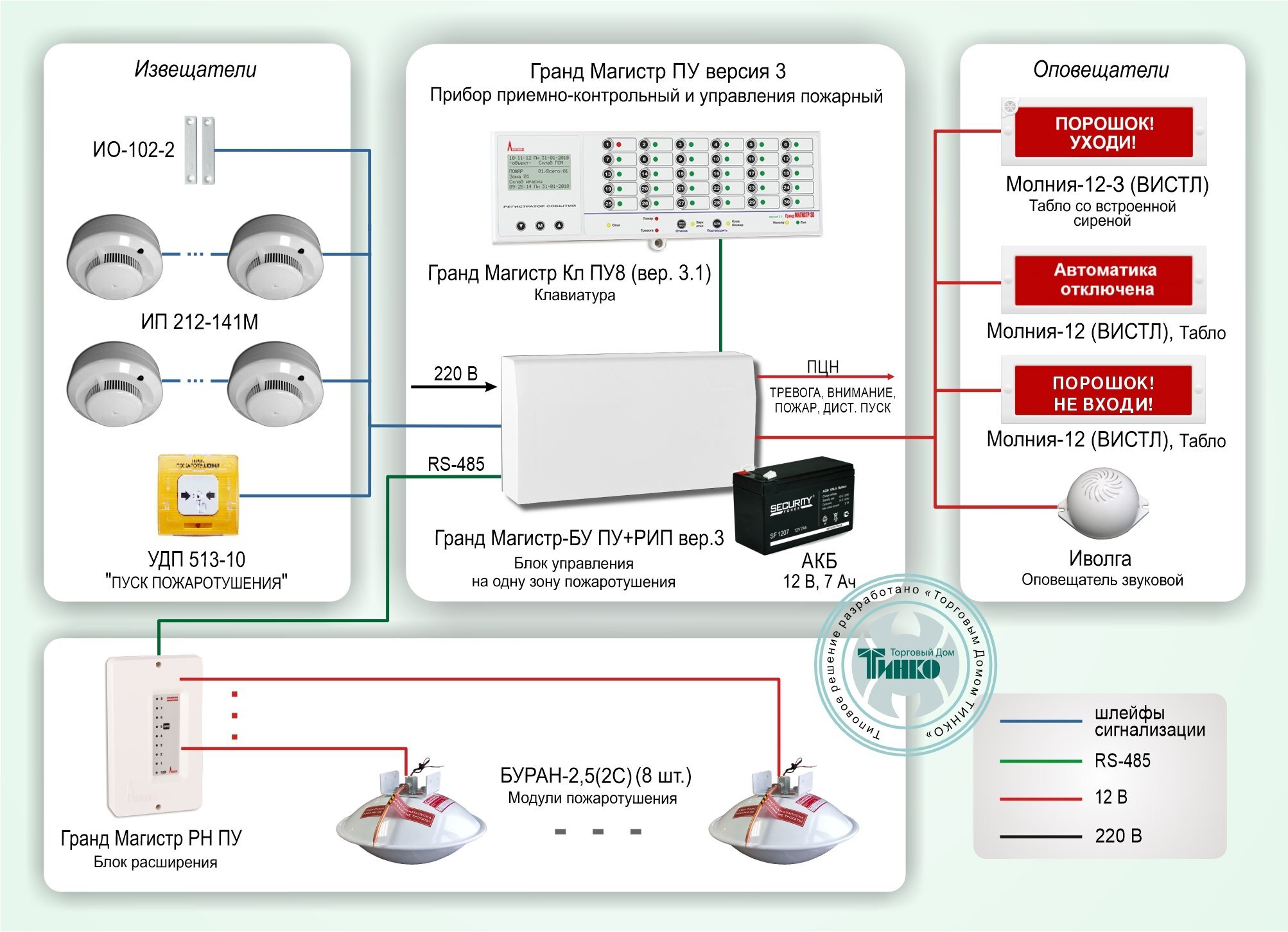 Система пожаротушения и охранно-пожарная сигнализация на базе ППКОП Гранд Магистр ПУ Магистраль Типовое решение: СП-004
