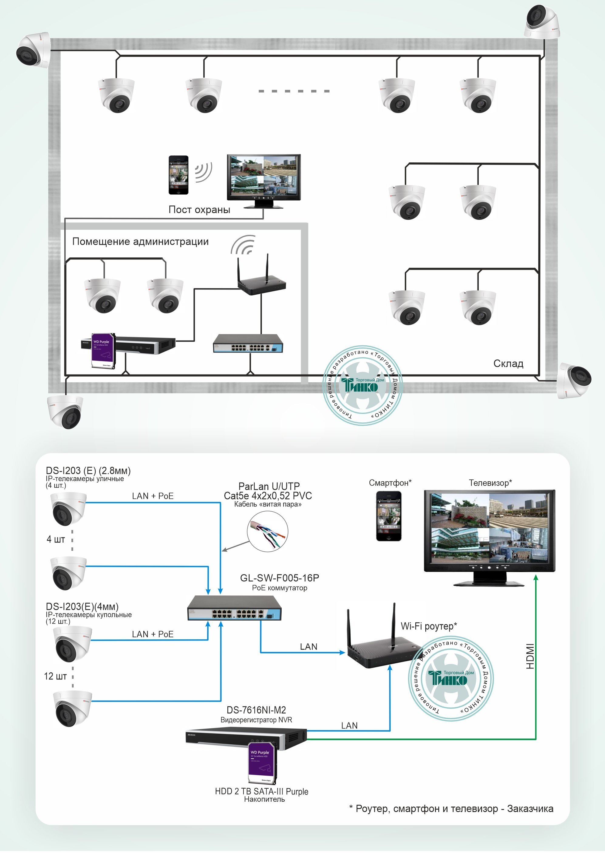 Система видеонаблюдения на складе с использованием 16-ти камер с питанием по PoE HiWatch Типовое решение: ТСН-012