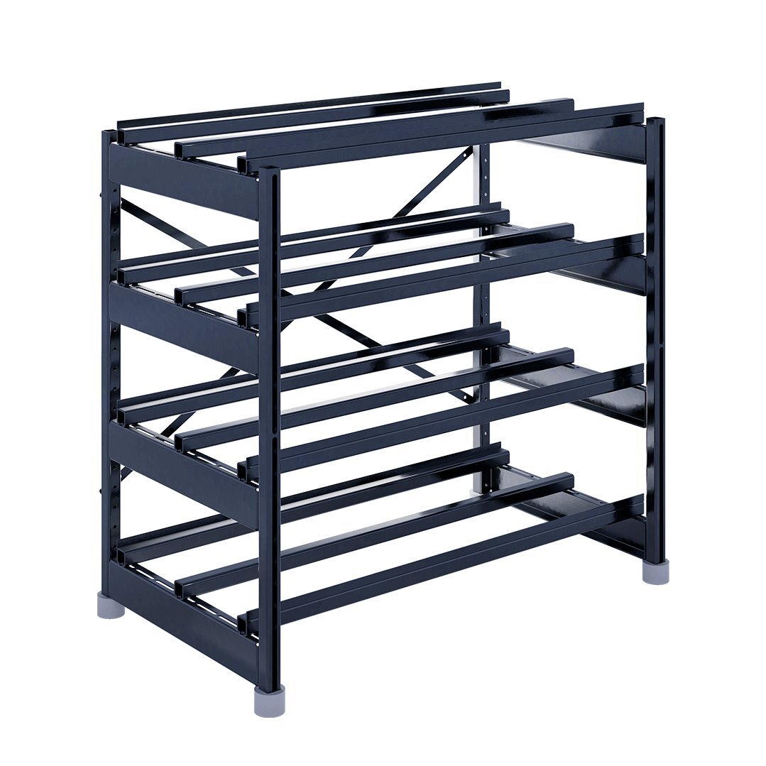 Стеллаж аккумуляторный; 4 яруса; под 40 фронт-терминальных АКБ до 125Ач ; грузоподъёмность стеллажа/полки 2040/510 кг; 1200х660х1575 мм