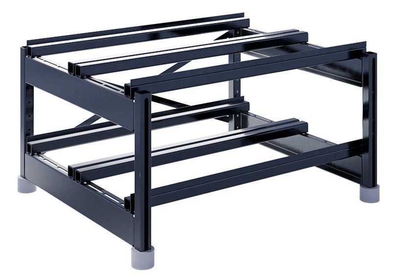 - Сборно-разборная конструкция. Позволяет подстраивать положение поперечных балок, исходя из размеров аккумулятора, а также перемещать ярусы в допустимых диапазонах.