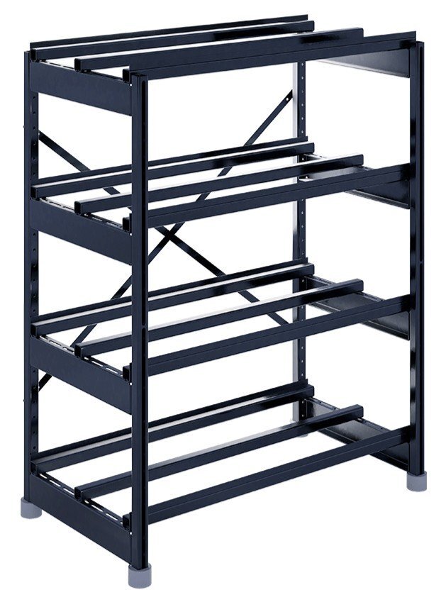 Сборно-разборная система позволяет подстраивать положение поперечных балок, исходя из размеров аккумулятора, а также перемещать ярусы в допустимых диапазонах.