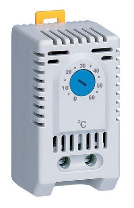 Термостат механический на DIN-рейку NO - для включения вентилятора. Задаваемая t-включения от -0...+60°C, IP20, габ. 60х33х43 мм.