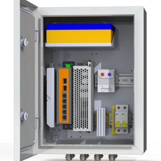 Коммутационный термошкаф: промышленный управляемый коммутатор 4хRJ45 10/100/1000 Мб/с PoE 802.3 af/at watchdog, 2хSFP 1000 Мб/с бюджет PoE 140 Вт, блок питания 155Вт/48-58 В, обогреватель 50Вт, сдвоенный термостат, оптический кросс 4 порта SC, гермовводы 4хPG9, 4хPG13.5, автомат 6А, цвет серый, АКБ 12В 2.2Ач 4 шт, 230 В AC, 210Вт, IP66, -60°С... +50°С, 300х400х210 мм._x000D_