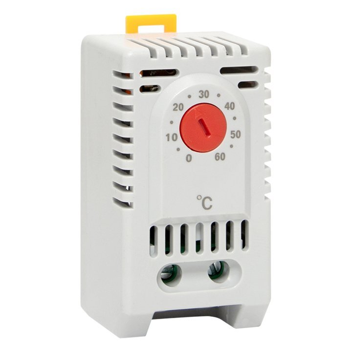 Термостат механический на DIN-рейку NC - для включения обогревателя. Задаваемая t-включения +5…+60°C, I-коммут. 10 А, U-номин. 230 В, IP20, габ.размеры 60х33х43 мм. Подключение: винтовой зажим 2.5 мм?