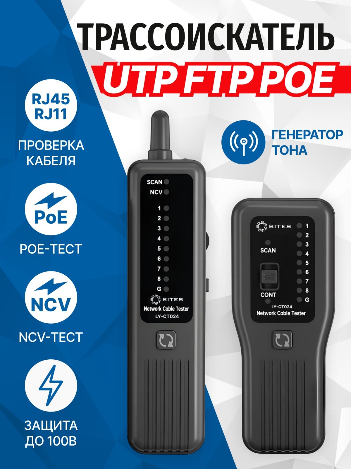 Многофункциональный PоE тестер-трассоискатель состоящий из передатчика и приемника, который предназначен для монтажа линий телекоммуникационных сетей и регламентных работ по техническому обслуживанию линий связи, STP/UTP (CAT5, CAT5е, CAT6, TEL), 1хRJ45, 1хRJ11, DC 9 В (в комплект не входит), 130х52.8х28 мм.