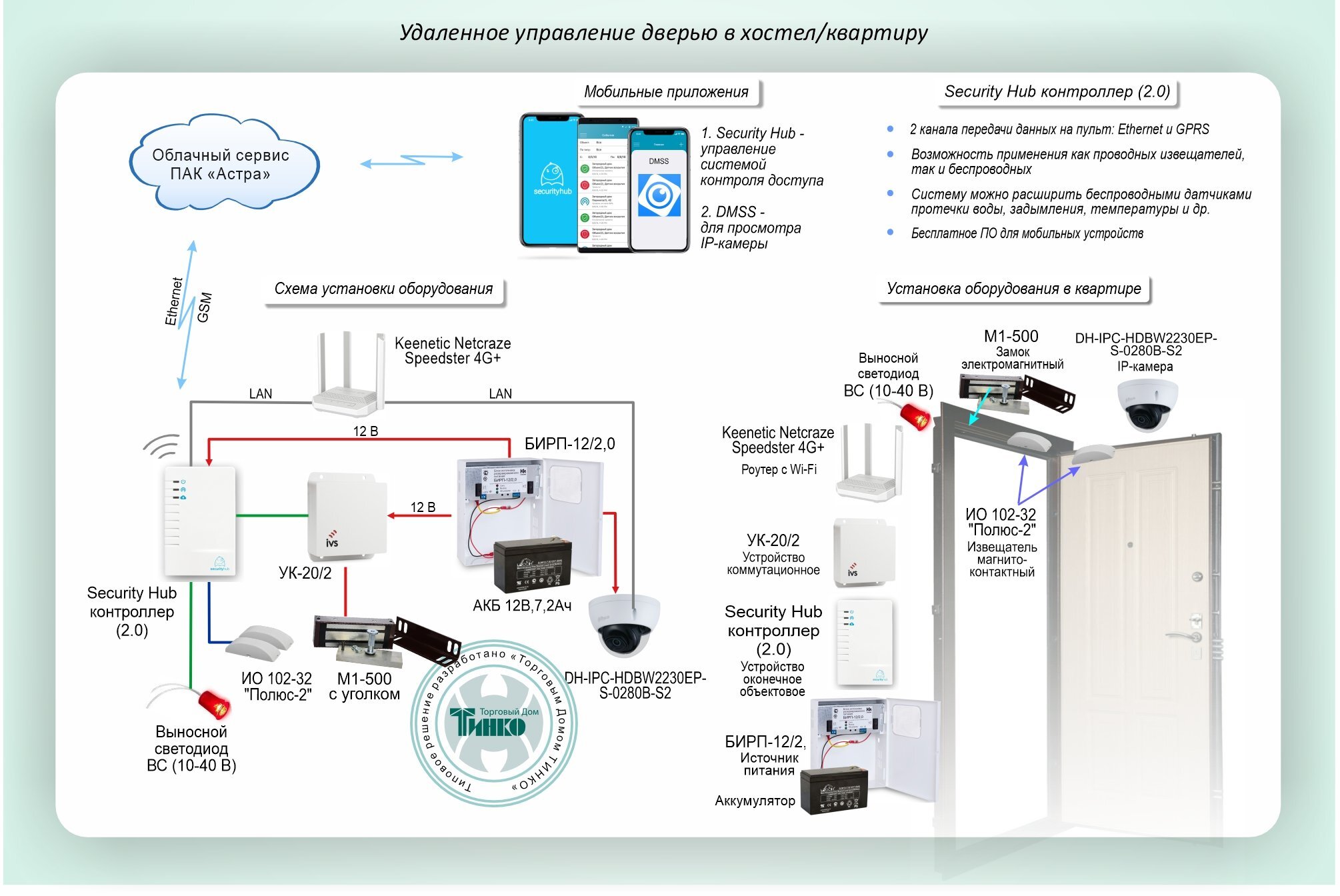 Удаленное управление дверью в хостел/квартиру на базе контроллера Security Hub ТЕКО Типовое решение: СКУД-023