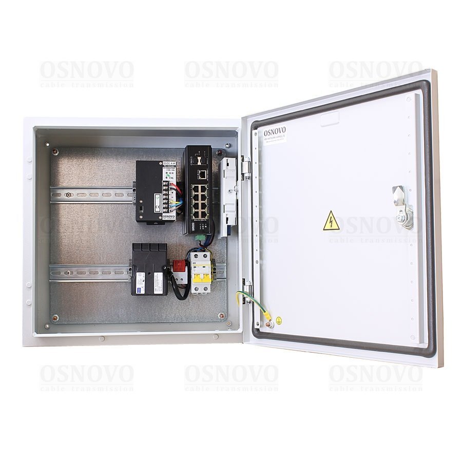 Коммутатор неуправляемый 11 портовый c термостабилизацией; 6хRJ-45 POE 10/100 Base-T, Метод A (IEEE 802.3af/at) до 30Вт, 2хRJ-45 POE 10/100 Base-T, Метод A+В (IEEE 802.3af/at) до 60Вт, бюджет POE 240Вт; 1хRJ-45 10/100/1000 Base-T; 2xSFP 10/100/1000 Base-T; AC 100-240В; встроенная грозозащита 6кВ; 400x400x210мм; IP66; -50...+50°С. В комплекте оптическая розетка, КДЗС (2шт), пигтейлы SM SC/UPC (2шт). Корпус из металла. Поддержка режима CCTV передачи данных и питания до 250м.