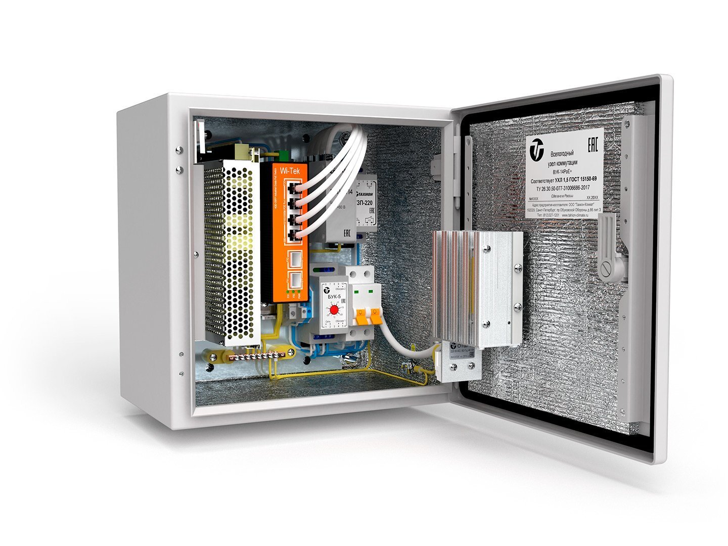 Всепогодный узел коммутации: неуправляемый гигабитный коммутатор, 4xRJ45 порта POE 10/100/1000Мб(af/at); 2хSFP порта 1G; POE бюджет 120Вт; система Watchdog; блок управления климатом БУК-5; источником питания 55В/150Вт, устройством защиты электропитания УЗП-220; блоком защиты от импульсных перенапряжений БЗЛ-ЕП4; тамперный контакт; корпус из стали; IP66; -60…+50°С; AC 220В; 170Вт; гермовводы; 300х300х210 мм.