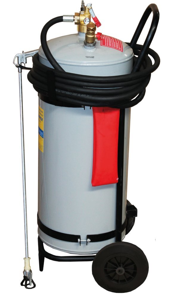 Установка представляет собой металлическую емкость 60л (с внутренним полимерным покрытием) на тележке, соединенную с распылителем, имеющим 9-ти метровый гидрорукав.
