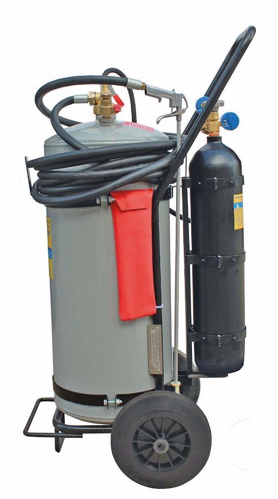 Установка представляет собой металлическую емкость 60л (с внутренним полимерным покрытием) на тележке, соединенную с распылителем, имеющим 9-ти метровый гидрорукав, пусковой баллон с редуктором.