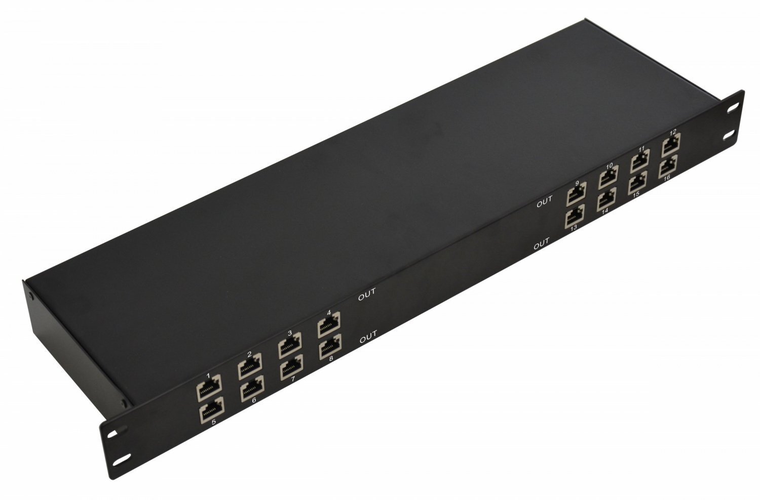 Устройство грозозащиты линий Ethernet с РоЕ, на 16 портов, 1U; ток разряда 2.5 кА ном/5кА макс(8/20 мкс), защищаемые контакты: 1/2/3/6; 4/5/7/8, вход/выход: RJ45 1х10/100/1000Мб/с; монтаж в 19" стойку; защита линии PoE IEEE802.3af/at; рабочее напряжение в линии данных 5/48В ном, 6/60В макс, -40...+80°C, 484х130х45 мм.