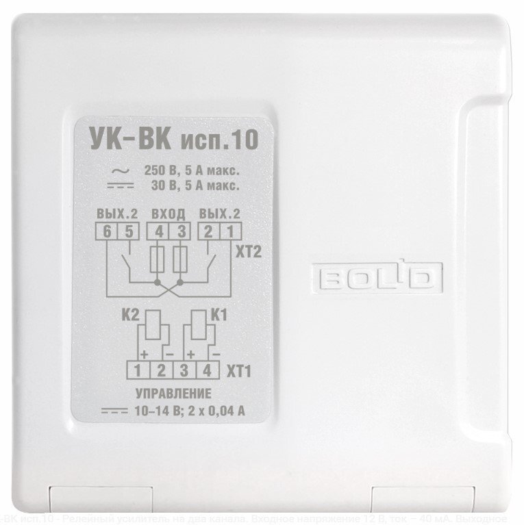 Устройство коммутационное УК-ВК в системах охранной сигнализации и контроля доступом предназначено для коммутации исполнительных устройств (ламп, сирен, видеокамер, электромагнитных замков и т.д.) в сети переменного тока номинальным напряжением 220 В или в цепях постоянного тока до 30 В путём замыкания, размыкания и переключения контактов реле. В системах пожарной сигнализации устройство предназначен для передачи стартового импульса на прибор пожарный управления.