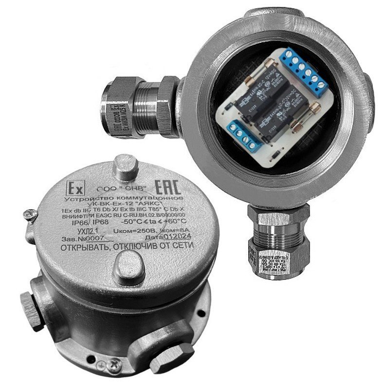 Устройство коммутационное взрывозащищенное УК-ВК-Ех АЯКС - коммутационное устройство, предназначенное для управления подключением и отключением приборов, входящих в состав систем охранной или охранно-пожарной сигнализации, коммутации исполнительных устройств (ламп, сирен, видеокамер, систем пожаротушения, электромагнитных замков и т.д.) в сети переменного тока номинальным напряжением 220 В или цепях постоянного тока до 30 В путем замыкания или размыкания контактов реле.
