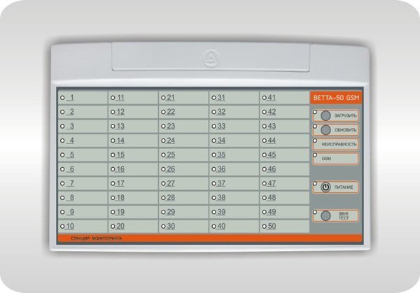 Станция мониторинга контролирует 50 зон охраны, к каждой из которых может быть привязан прибор GSM-охраны, или сигнализатор. Каждой зоне соответствует светодиодный индикатор, отображающий следующие состояния: