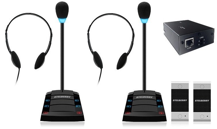 Комплект "клиент-кассир" с подключаемыми наушниками и системой записи переговоров, 2400 часов на MicroSD карту, сенсорное управление, линейный выход, антивандальная панель, уголок, подсветка микрофона, в комплекте: 2-канальный аудиорегистратор Sprut SR-500/2 + 2 переговорных устройства STELBERRY S-400 + комплект для коммутации + блоки питания