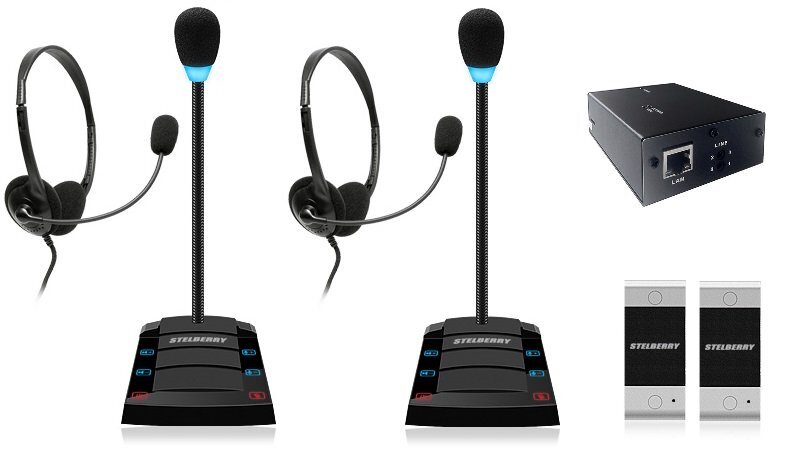 Комплект "клиент-кассир" с подключаемой гарнитурой и системой записи переговоров, 2400 часов на MicroSD карту, сенсорное управление, линейный выход, антивандальная панель, уголок, подсветка микрофона, в комплекте: 2-канальный аудиорегистратор Sprut SR-500/2 + 2 переговорных устройства STELBERRY S-400 + комплект для коммутации + блоки питания