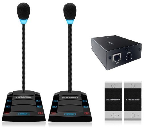 Комплект "клиент-кассир" с режимом "симплекс" и системой записи переговоров, 2400 часов на MicroSD карту, сенсорное управление, линейный выход, антивандальная панель, уголок, подсветка микрофона, в комплекте: 2-канальный аудиорегистратор Sprut SR-500/2 + 2 переговорных устройства STELBERRY S-400 + комплект для коммутации + блоки питания