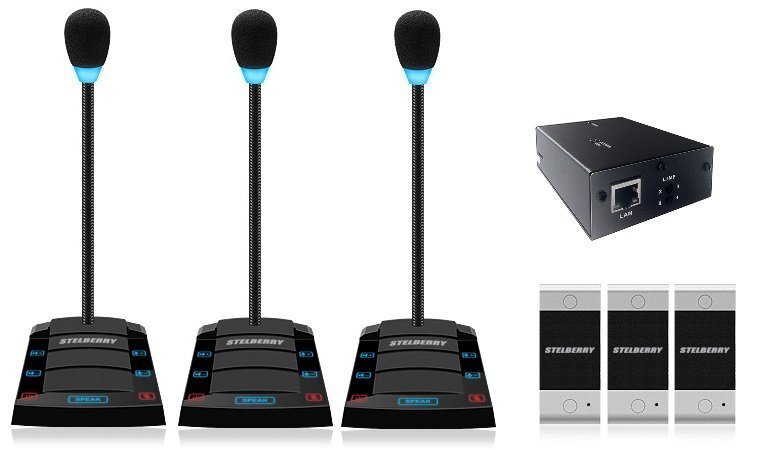 Комплект "клиент-кассир" с режимом "симплекс" и системой записи переговоров, 2400 часов на MicroSD карту, сенсорное управление, линейный выход, антивандальная панель, уголок, подсветка микрофона, в комплекте: 4-канальный аудиорегистратор Sprut SR-500/4 + 3 переговорных устройства STELBERRY S-400 + комплект для коммутации + блоки питания