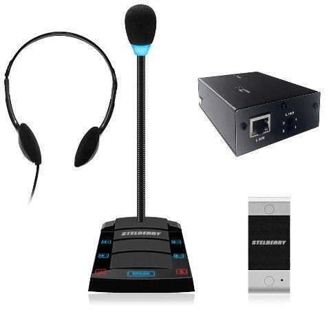 Комплект "клиент-кассир" с режимом "симплекс", наушниками и системой записи переговоров, 2400 часов на MicroSD карту, сенсорное управление, линейный выход, антивандальная панель, уголок, подсветка микрофона, в комплекте: 2-канальный аудиорегистратор Sprut SR-500/2 + 1 переговорное устройство STELBERRY S-400 + комплект для коммутации + блоки питания