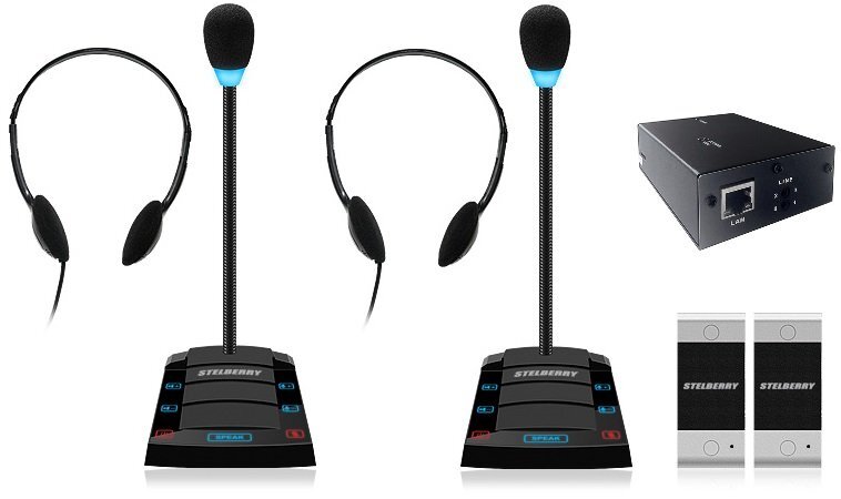 Комплект "клиент-кассир" с режимом "симплекс", наушниками и системой записи переговоров, 2400 часов на MicroSD карту, сенсорное управление, линейный выход, антивандальная панель, уголок, подсветка микрофона, в комплекте: 2-канальный аудиорегистратор Sprut SR-500/2 + 2 переговорных устройства STELBERRY S-400 + комплект для коммутации + блоки питания