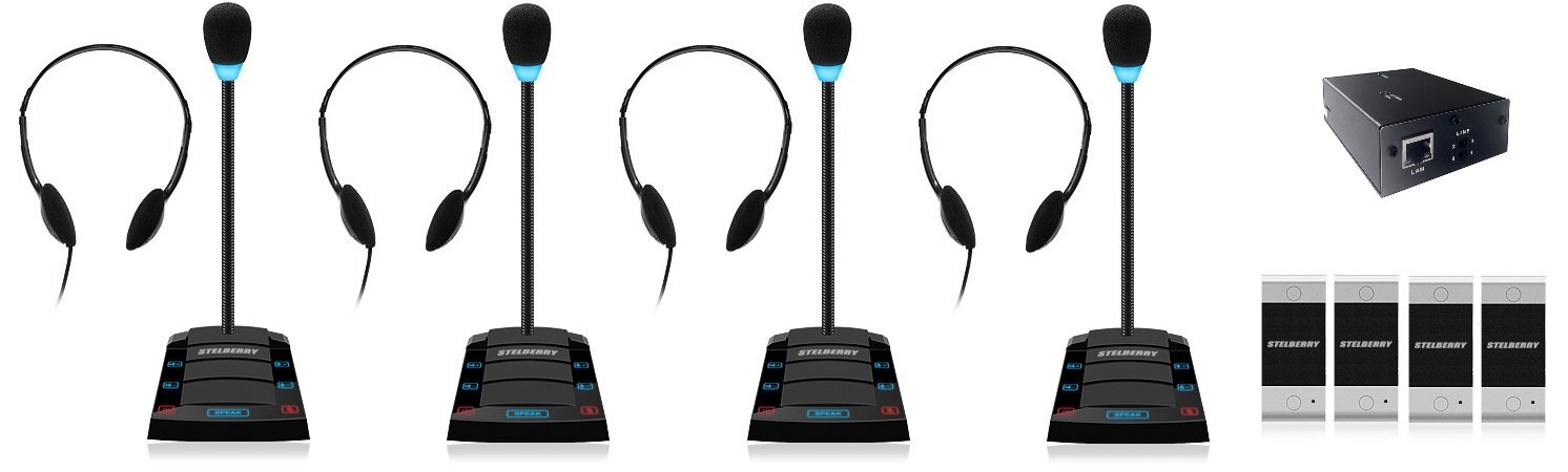 Комплект "клиент-кассир" с режимом "симплекс", наушниками и системой записи переговоров, 2400 часов на MicroSD карту, сенсорное управление, линейный выход, антивандальная панель, уголок, подсветка микрофона, в комплекте: 4-канальный аудиорегистратор Sprut SR-500/4 + 4 переговорных устройства STELBERRY S-400 + комплект для коммутации + блоки питания