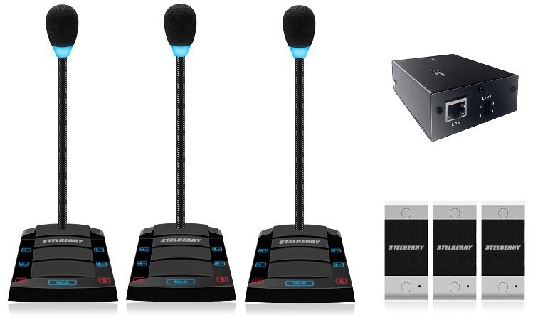 Комплект "клиент-кассир" с функцией речевого оповещения и системой записи переговоров, 2400 часов на MicroSD карту, сенсорное управление, линейный выход, антивандальная панель, уголок, подсветка микрофона, в комплекте: 4-канальный аудиорегистратор Sprut SR-500/4 + 3 переговорных устройства STELBERRY S-400 + комплект для коммутации + блоки питания