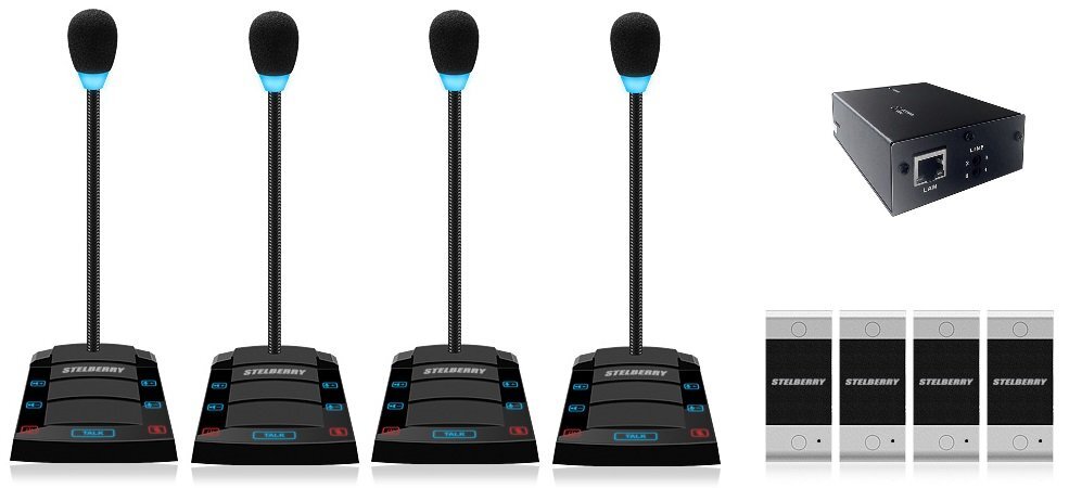 Комплект "клиент-кассир" с функцией речевого оповещения и системой записи переговоров, 2400 часов на MicroSD карту, сенсорное управление, линейный выход, антивандальная панель, уголок, подсветка микрофона, в комплекте: 4-канальный аудиорегистратор Sprut SR-500/4 + 4 переговорных устройства STELBERRY S-500 + комплект для коммутации + блоки питания