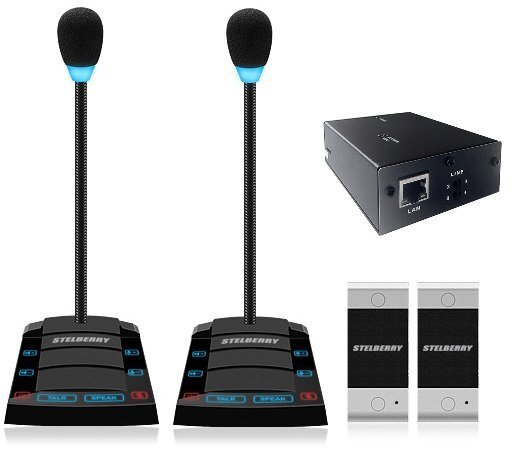 Комплект "клиент-кассир" с режимом "симплекс", функцией речевого оповещения и системой записи переговоров, 2400 часов на MicroSD карту, сенсорное управление, линейный выход, антивандальная панель, уголок, подсветка микрофона, в комплекте: 2-канальный аудиорегистратор Sprut SR-500/2 + 2 переговорных устройства STELBERRY S-400 + комплект для коммутации + блоки питания