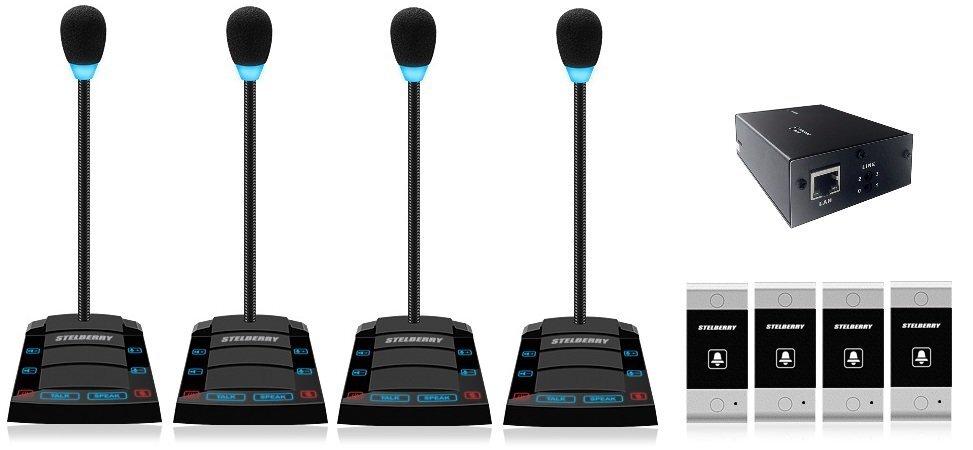 Комплект "клиент-кассир" с режимом "симплекс", вызовом, функцией речевого оповещения и системой записи переговоров, 2400 часов на MicroSD карту, сенсорное управление, линейный выход, антивандальная панель, уголок, подсветка микрофона, в комплекте: 4-канальный аудиорегистратор Sprut SR-500/4 + 4 переговорных устройства STELBERRY S-400 + комплект для коммутации + блоки питания