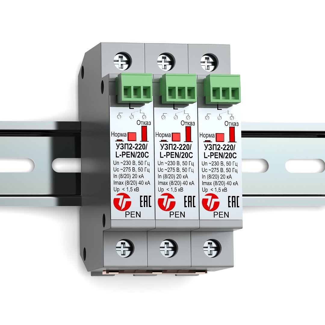 Устройство защиты электрооборудования распределительных сетей 220 (230) В AC от импульсных перенапряжений, комплект УЗП2-220К/3L-PEN/20С предназначено для защиты оборудования, подключённого к линиям электропитания переменного тока 220 (230) В, от наведенных напряжений, вызванных электромагнитными импульсами высоких энергий (грозовыми, электростатическими разрядами и т.д.).
