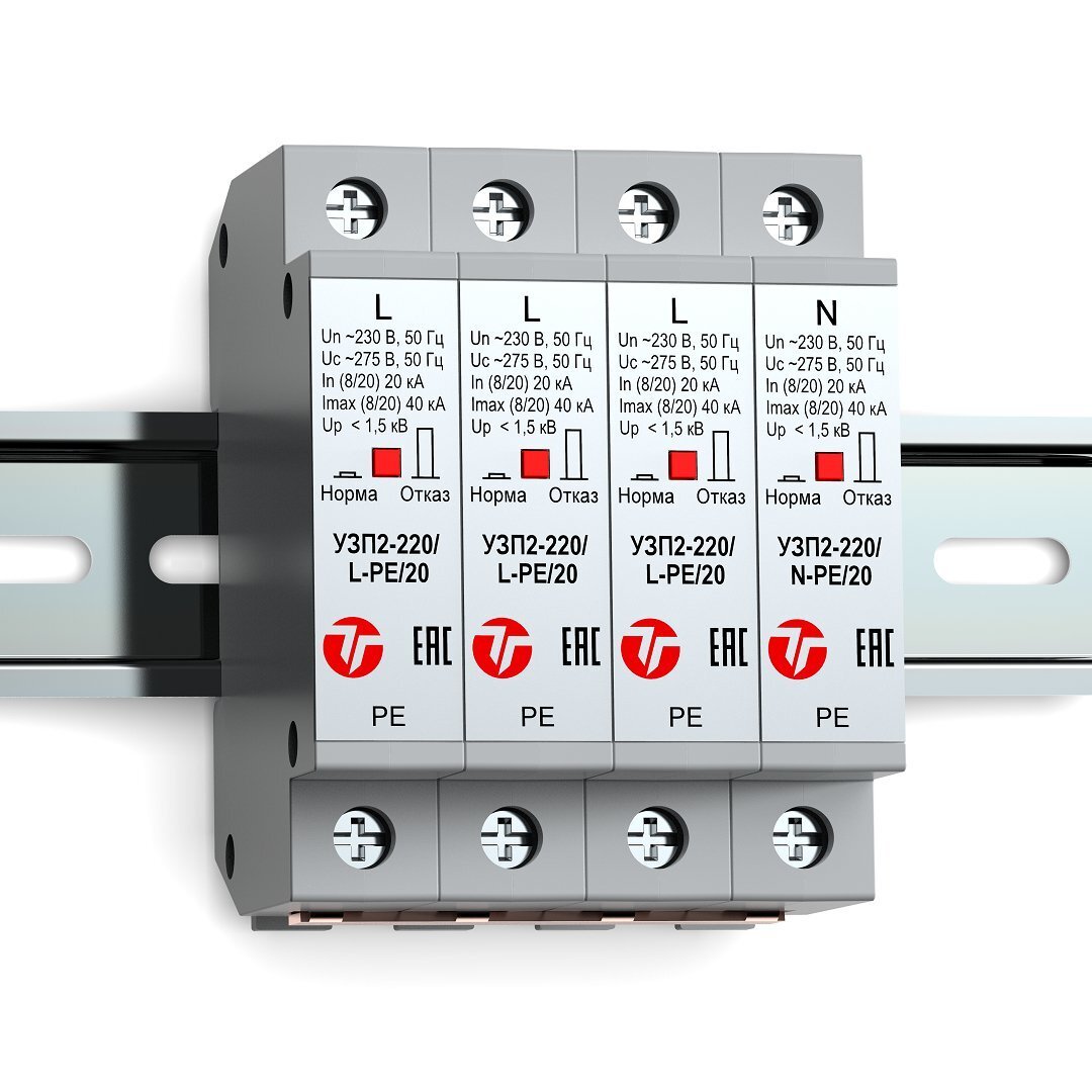Устройство защиты электрооборудования распределительных сетей 220 (230) В AC от импульсных перенапряжений, комплект УЗП2-220К/3LN-PE/20 предназначено для защиты оборудования, подключённого к линиям электропитания переменного тока 220 (230) В, от наведенных напряжений, вызванных электромагнитными импульсами высоких энергий (грозовыми, электростатическими разрядами и т.д.).