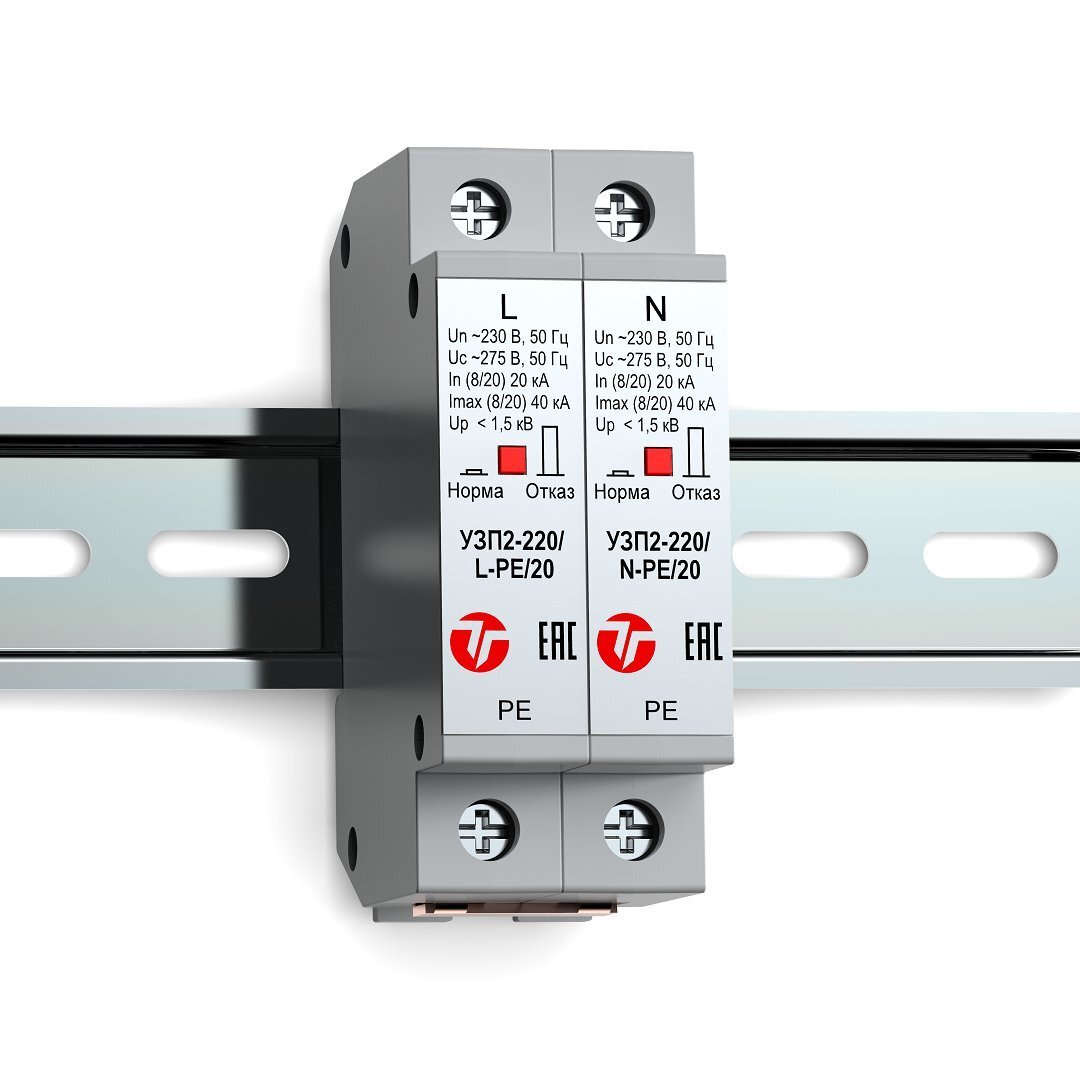 Устройство защиты электрооборудования распределительных сетей 220 (230) В AC от импульсных перенапряжений, комплект УЗП2-220К/LN-PE/20 предназначено для защиты оборудования, подключённого к линиям электропитания переменного тока 220 (230) В, от наведенных напряжений, вызванных электромагнитными импульсами высоких энергий (грозовыми, электростатическими разрядами и т.д.).