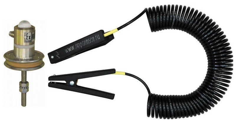 Устройство: в комплект устройства входят индикатор и заземляющий проводник. В индикаторе расположены яркий светодиод красного цвета и плата контроллера, залитые компаундом, и литиевый элемент питания типа CR123. Крепление индикатора и электрическое соединение с магистралью заземления осуществляется при помощи шпильки М8 и имеющихся в комплекте зубчатых шайб и гаек. Широкий угол обзора светодиода индикатора (180°) позволяет крепить индикатор в разных положениях. Заземляющий проводник состоит из двух одинаковых пружинных контактных зажимов, соединенных между собой двухпроводным спиральным кабелем.
