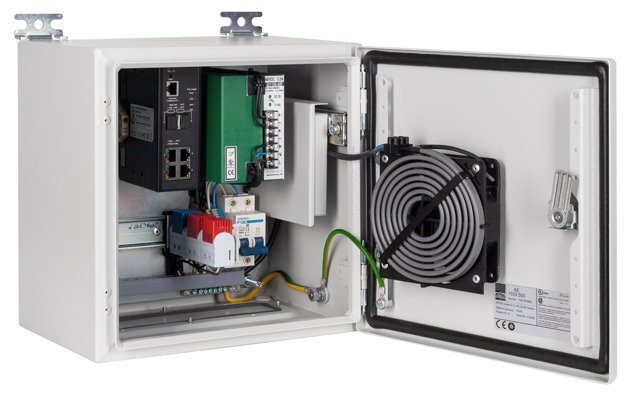 Узел доступа уличный, с нагревателем; коммутатор сетевой промышленный гигабитный управляемый с PoE, 6 портовый; 4xRJ45 РоЕ 10/100/1000 Мбит/с; IEEE 802.3at/af; 2xSFP Uplink 1000 Мбит/с; PoE бюджет до 120 Вт; вариант работы РоЕ A; DC 48…56В; IP30; сталь, оптический кросс укомплектованный на 12LC/SC адаптеров; БП DC 48В, 150Вт, IK10, -40…+60°C; 300х400х210 мм.