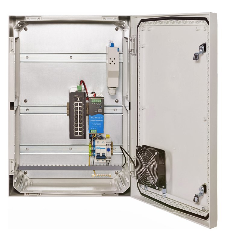 Узел доступа уличный, с нагревателем; коммутатор сетевой промышленный гигабитный неуправляемый с PoE, 18 портовый; 16xRJ45 РоЕ 10/100/1000 Мбит/с; IEEE 802.3at/af; 2xSFP Uplink 1000 Мбит/с; PoE бюджет до 240 Вт; вариант работы РоЕ A; DC 48…56В; IP30; поликарбонат, оптический кросс укомплектованный на 12LC/SC адаптеров; БП DC 48В, 360Вт, IK10, -40…+60°C; 380х600х210 мм.