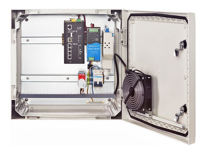 Узел доступа уличный, с вентилятором; коммутатор сетевой промышленный гигабитный управляемый с PoE, 10 портовый; 8xRJ45 РоЕ 10/100/1000 Мбит/с; IEEE 802.3at/af; 2xSFP Uplink 100/1000 Мбит/с; 2xSFP Uplink 100/1000/2500 Мбит/с; PoE бюджет до 240 Вт; вариант работы РоЕ A; DC 48…56В; IP30; поликарбонат, оптический кросс укомплектованный на 12LC/SC адаптеров; БП DC 48В, 360Вт, IK10, -40…+60°C; 400х400х210 мм.