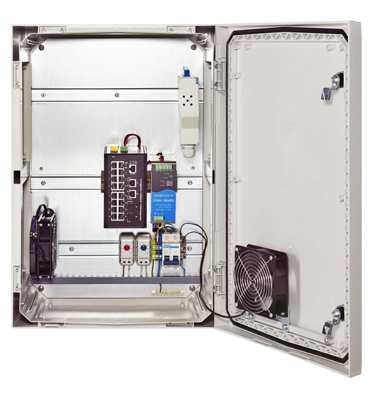 Узел доступа уличный, с вентилятором; коммутатор сетевой промышленный гигабитный управляемый с PoE, 20 портовый; 16xRJ45 РоЕ 10/100/1000 Мбит/с; IEEE 802.3at/af; 2xRJ45 Uplink 10/100/1000 Мбит/с; 2xSFP Uplink 100/1000 Мбит/с; PoE бюджет до 320 Вт; вариант работы РоЕ A; DC 48…56В; IP30; поликарбонат, оптический кросс укомплектованный на 12LC/SC адаптеров; БП DC 48В, 500Вт, IK10, -40…+60°C; 380x600x210 мм.