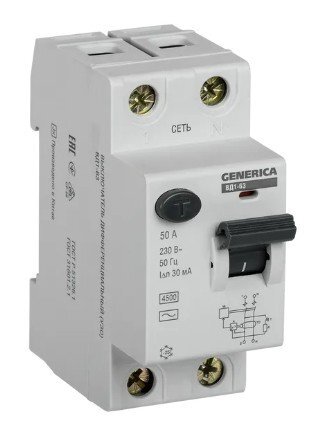 Быстродействующий защитный выключатель ВД1-63 (УЗО) GENERICA - устройство электронного типа, зависящее от напряжения и реагирующее на дифференциальный ток, без встроенной защиты от сверхтоков. Предназначен для защиты человека от поражения электрическим током.
