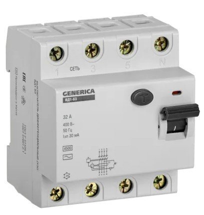 Быстродействующий защитный выключатель ВД1-63 (УЗО) GENERICA - устройство электронного типа, зависящее от напряжения и реагирующее на дифференциальный ток, без встроенной защиты от сверхтоков. Предназначен для защиты человека от поражения электрическим током.