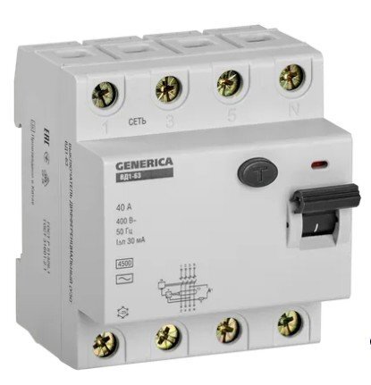 Быстродействующий защитный выключатель ВД1-63 (УЗО) GENERICA - устройство электронного типа, зависящее от напряжения и реагирующее на дифференциальный ток, без встроенной защиты от сверхтоков. Предназначен для защиты человека от поражения электрическим током.