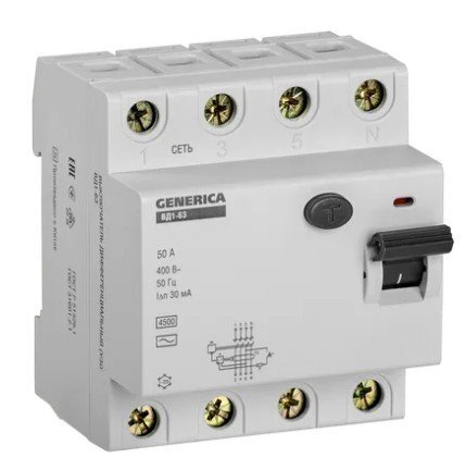 Быстродействующий защитный выключатель ВД1-63 (УЗО) GENERICA - устройство электронного типа, зависящее от напряжения и реагирующее на дифференциальный ток, без встроенной защиты от сверхтоков. Предназначен для защиты человека от поражения электрическим током.