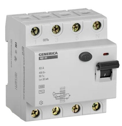 Быстродействующий защитный выключатель ВД1-63 (УЗО) GENERICA - устройство электронного типа, зависящее от напряжения и реагирующее на дифференциальный ток, без встроенной защиты от сверхтоков. Предназначен для защиты человека от поражения электрическим током.